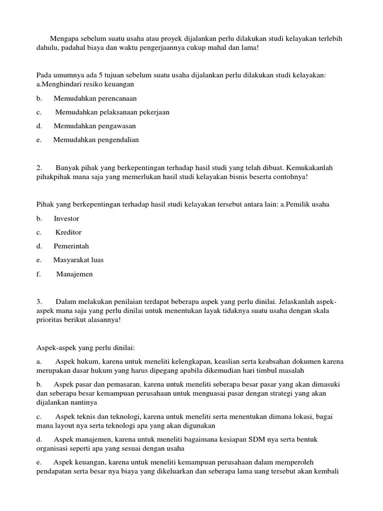 Latihan soal pilihan ganda bab studi kelayakan bisnis. Soal desain studi kelayakan bisnis draft. Contoh soal ujian manajemen sumber daya manusia msdm. Persiapan yang diperlukan dalam perancangan studi kelayakan bisnis: Bmp ekma4311 studi kelayakan bisnis. Apr 15, 2014 · soal studi kelayakan bisnis. Secara singkat studi kelayakan bisnis bisa dikatakan sebagai kegiatan yang dilakukan untuk mengamati sebuah bisnis atau usaha yang sedang berjalan, ada banyak tujuan dilakukannya studi kelayakan bisnis, seperti menentukan tujuan, memecahkan masalah, menentukan hasil dan masih banyak lagi. Begitulah informasi yang bisa kami uraikan mengenai contoh soal dan jawaban studi kelayakan bisnis. A) pengumpulan data dan informasi. Nov 24, 2020 · soal dan kunci jawaban tentang studi kelayakan bisnis diatas, bisa anda download secara gratis dalam bentuk pdf atau dokumen melalui link yang sudah kami sediakan dibagian bawah ini. Nov 24, 2020 · soal studi kelayakan bisnis bagian 2. Kali ini soal yang diberikan adalah soal latihan mandiri studi kelayakan bisnis ekma4311 universitas terbuka. May 24, 2017 · 1.