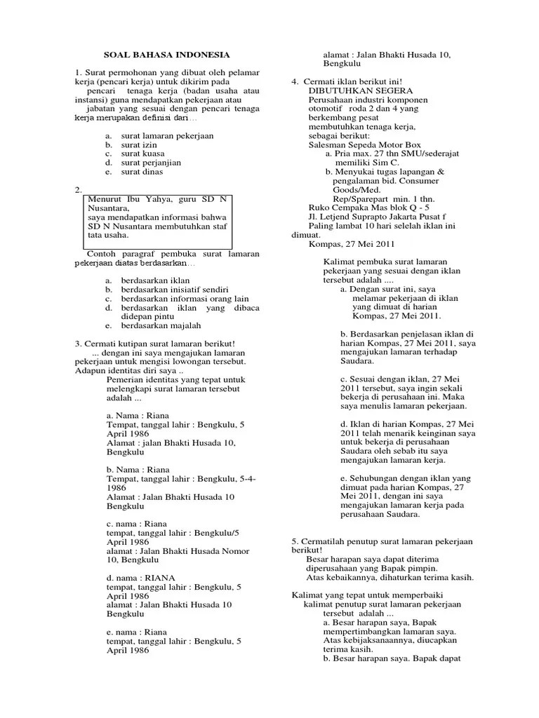 Sebuah surat lamaran pekerjaan mengandung bagian yang berfungsi sebagai informasi awal terkait dengan pekerjaan yang akan dilamar. Bangku kelas 4 soal ulangan harian matematika kelas 3 bab pecahan matematika matematika kelas 4 pecahan. soal ulangan kelas 12 materi surat lamaran novel dan editorial 1. Contoh soal un smk surat lamaran pekerjaan. Tidak terasa sebentar lagi kita akan menghadapi unbk sekitar bulan april 2020, berikut latihan soal unbk bahasa indonesia tentang surat lamaran